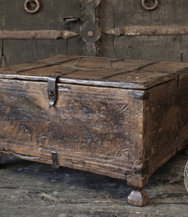 Antieke Dauri box uit India met een unieke, handgemaakte uitstraling. Dit bijzondere stuk weerspiegelt traditioneel vakmanschap en rijke Indiase cultuur. Perfect als decoratief object dat karakter, historie en tijdloze charme toevoegt aan elk interieur.