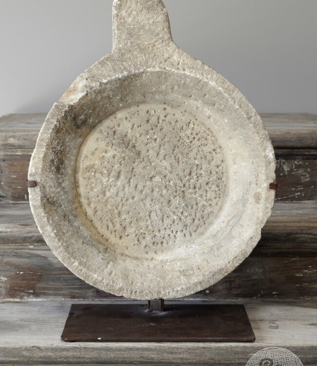 Deze prachtige antieke schaal op standaard is een plaatje om te zien. De schaal is gemaakt van marmer en is een uniek exemplaar. Het beeld komt uit India en heeft een authentieke uitstraling. Dit zorgt ervoor dat hij prachtig staat in een landelijk interieur.
