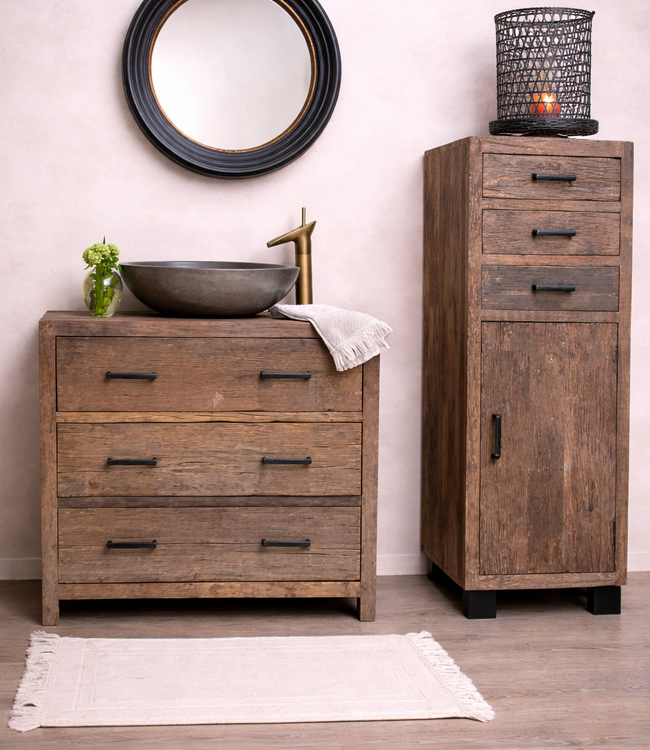 Badkamerkast Larrano is maar liefst 130 cm lang en voorzien van 3 lades en 1 deur. Het verweerde oude hout heeft een rustieke uitstraling. De getoonde prijs is inclusief levering aan huis en via het keuzemenu kunt u kiezen voor wel/geen behandeling.