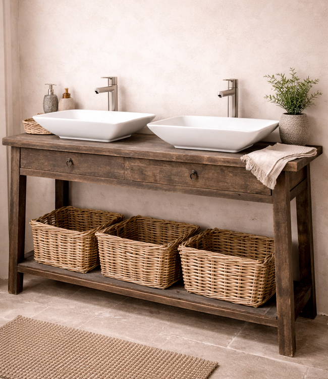 Badmeubel Bertus is volledig gemaakt van hergebruikt oud hout en voorzien van 2 brede lades. Het meubel is voorzien van poten die schuin aflopen, iets unieks. De gangbare hoogte van 72 cm en diepte van 47 cm zorgen voor voldoende ruimte voor waskommen en accessoires. Bertus produceren we niet zelf in onze werkplaats, helaas is er dus geen maatwerk in mogelijk. Dit landelijke badkamermeubel staat op voorraad en leveren we binnen een week in NL & BE.