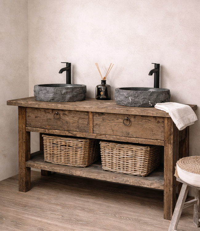 Badkamermeubel Henk is het broertje van Noud, waar Noud voorzien is van schuine poten heeft Henk rechte poten. Kies eenvoudig je gewenste lengte van het blad in het keuzemenu van dit exclusieve en volledig met de hang gemaakte badmeubel. Het oud geborstelde eikenhout hebben we 2 jaar laten drogen om hier vervolgens dit meubel van te maken. Henk is verkrijgbaar in verschillende afmetingen en snel leverbaar dankzij onze eigen ambachtelijke werkplaats. Het landelijke badkamermeubel kan via het keuzemenu volledig behandeld tegen spatwater besteld worden. Het badmeubel is voorzien van 2 soft-close lades. De lengte kan gekozen worden in het keuzemenu, de andere afmetingen zijn standaard maar maatwerk is hier in mogelijk. Al onze artikelen bezorgen we gratis in NL & BE.