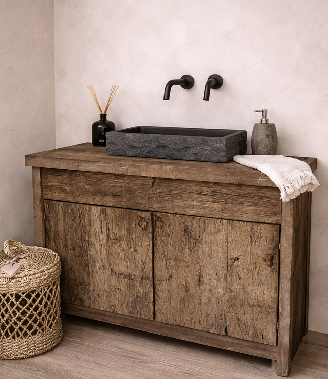 Herjan is een robuust landelijk badkamermeubel welke we volledig maken in eigen werkplaats. Het oud geborstelde eikenhouten badmeubel is voorzien van sfeervolle handgreepjes en kan gecombineerd worden met elke waskom/wastafel. Kies in het keuzemenu zelf je gewenste lengte. In onze eigen ambachtelijke werkplaats produceren we dit meubel van écht oud hergebruikt geborsteld eikenhout. Het hout droogt 2 jaar in onze opslag en voor onze meubels kiezen we vervolgens de mooiste wagondelen uit. Herjan is voorzien van 2 soft-close deuren en een ruime (afneembare) binnenkant voor voldoende opbergruimte, en kan volledig behandeld worden aan de buitenkant via het keuzemenu. Een écht uniek badkamermeubel? Ga dan voor Herjan. Altijd gratis levering aan huis in Nederland & België!