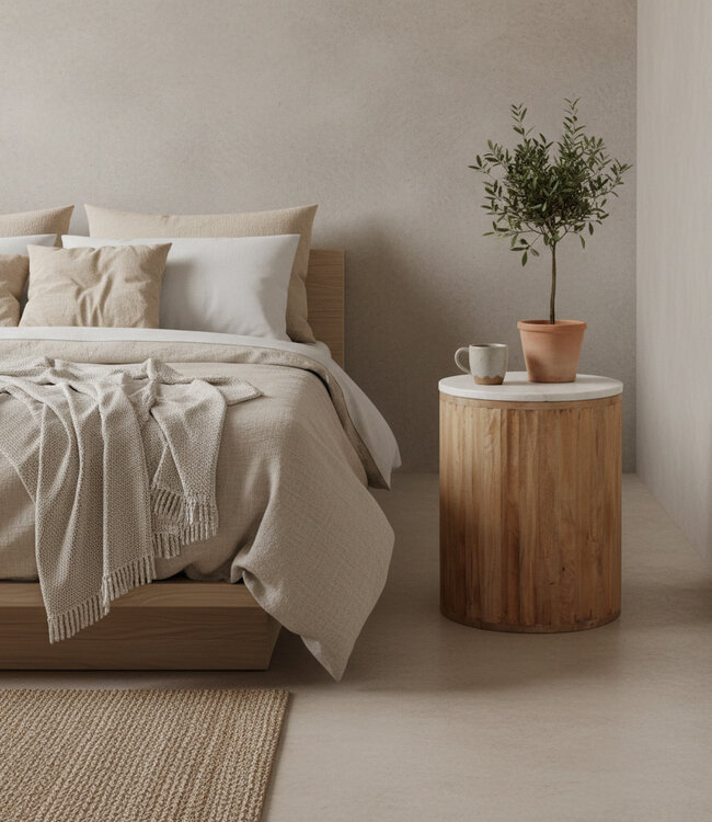De Malakka bijzettafel - ronde marmeren tafel met mangohouten onderstel De Malakka bijzettafel voegt een rustige en warme touch toe aan elk interieur. Het ronde blad van wit marmer rust op een cilindervormig onderstel van licht mangohout, met een subtiele, golvende structuur. De combinatie van het frisse marmer en het warme hout zorgt voor een natuurlijke balans die bij elk interieur past, of het nu modern, bohemian of klassiek is. Deze tafel is ideaal als bijzettafel, plantentafel of klein koffietafeltje naast de bank. Het stevige marmeren blad en het massieve hout maken de tafel niet alleen esthetisch aantrekkelijk, maar ook praktisch in gebruik. De Malakka is ook verkrijgbaar in een variant met zwart marmer en donker mangohout, genaamd Langkawi. Deze twee tafels zijn prachtig te combineren en brengen diepte en contrast in je woonkamer.