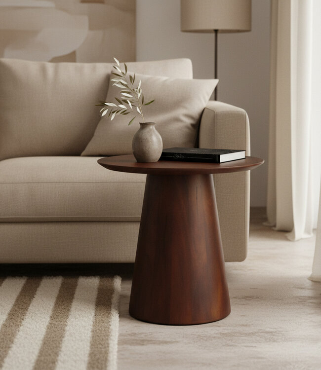 De Bullnose Cone bijzettafel is gemaakt van massief mangohout en heeft een rond blad met een stevige, kegelvormige voet. Het eenvoudige ontwerp valt op door het gebruik van duurzaam mangohout, wat een natuurlijke sfeer in huis brengt. Deze tafel past perfect naast de bank, bij je favoriete stoel of kan gecombineerd worden met de hogere variant voor een harmonieus geheel. De Bullnose collectie kenmerkt zich door het gebruik van duurzaam mangohout uit India.