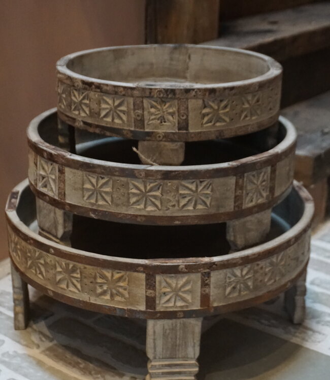 Deze set van 3 chakki tafeltjes in het grijs is een echte eyecatcher in elk interieur. De tafeltjes zijn perfect om accessoires, kaarsen of planten stijlvol te presenteren en geven direct een landelijke en stoere uitstraling aan de ruimte.