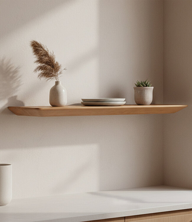 Geef uw wand een directe upgrade met de Craftsman wandplanken. Verkrijgbaar als set van twee (2×25 cm), als veelzijdige 60 cm plank of als royale 90 cm uitvoering, brengen deze planken een robuuste, industriële uitstraling in keuken, woonkamer of hal. Het onderscheidende ‘zwevende’ ontwerp verbergt de metalen dragers volledig in het hout; na montage lijken de massieve planken moeiteloos tegen de muur te zweven voor een strakke, moderne presentatie. Het ontwerp is geïnspireerd op de houten krukken uit de fabrieken van Chicago in de jaren ’30, zichtbaar in de subtiele, dunne rand en de verfijnde afwerking. Voor de Craftsman-collectie wordt uitsluitend teakhout gebruikt van gecertificeerde plantages in Indonesië. Omdat teak daar niet inheemse oerbossen gebruikt, worden geen waardevolle regenwouden aangetast. Sinds 2016 waarborgt het FLEGT-systeem de wettelijke en verantwoorde herkomst van het hout, waardoor deze keuze zowel esthetisch als ecologisch verantwoord is. Onderhoud is eenvoudig: teakhout is van nature duurzaam en slagvast. Een licht vochtig doekje volstaat om stof en vuil te verwijderen; daarna kort droogwrijven om achtergebleven vocht te verwijderen en de matte uitstraling te behouden. Olie of wax is niet noodzakelijk. Stylingvoorbeelden: plaats de 90 cm plank op werkhoogte in de keuken en monteer de twee 25 cm planken speels daarboven voor kruiden en accessoires. Creëer in de woonkamer rust en samenhang door twee 60 cm planken naast elkaar te hangen, aangevuld met een hangplant, ingelijste foto’s en een vintage object. Waarom kiezen voor Craftsman? • Magisch zwevend effect: volledig onzichtbare metalen dragers voor een strakke uitstraling. • Mix & match: 2×25 cm, 60 cm en 90 cm voor eindeloze combinaties. • Duurzaam teakhout: plantagehout met FLEGT-garantie, zonder kap van oerbossen. • Historisch geïnspireerd: industriële 1930s Chicago-stijl met karakteristieke rand. • Onderhoudsvriendelijk: enkel afnemen met een licht vochtige doek.