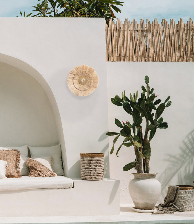 De wandlamp Double Trouble is een stijlvolle toevoeging aan uw entree, badkamer of woonkamer. Het design bestaat uit twee lagen natuurlijk gras met gouden details, waardoor het naadloos past bij elk interieur. Een verfijnd stuk kustontwerp! Kleur: Messing, Goud, Naturel Afmetingen (cm): 46 (H) x 10 (B) x 46 (L) Materialen: Gras, IJzer Inclusief bekabeling? Ja (E27 standaard fitting) De Double Trouble wandlamp is een ideale keuze voor wie op zoek is naar een combinatie van elegantie en functionaliteit in huis. Met zijn unieke ontwerp en hoogwaardige materialen zal deze lamp zeker de aandacht trekken en een vleugje stijl toevoegen aan uw ruimte. Laat uw interieur stralen met deze prachtige lamp!