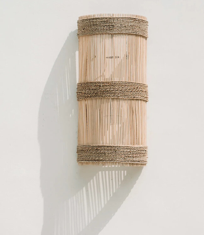 The Jalal Wall Applique introduces a unique sense of warmth and intimacy into any space that surpasses the ambiance created by a typical pendant light. Crafted from rattan, this exquisite wall lamp features a striking half-cylindrical design intertwined with seagrass cords, evoking a coastal charm. Illuminate your living area with this stunning piece and orchestrate a captivating play of light. - Note that the lamp shade does not come with electrical wiring or plugs. You can separately purchase suitable fittings from our collection, available in both ceiling-mounted and plug-in variations (compatible with EU outlets; for other regions, please use a standard fitting). Explore our assortment to discover the perfect match for your preferred style and functionality. Autumn / Autumn Decor / Boho / Boho Decor / Bohemian / Bohemian decor / Coastal Living / Eco-friendly / Wabi Sabi Kleur: Naturel Hoogte (cm): 50 Breedte (cm): 15 Lengte (cm): 25 Materialen: Rattan Inclusief bekabeling? Nee (gebruik een standaard E27 fitting)