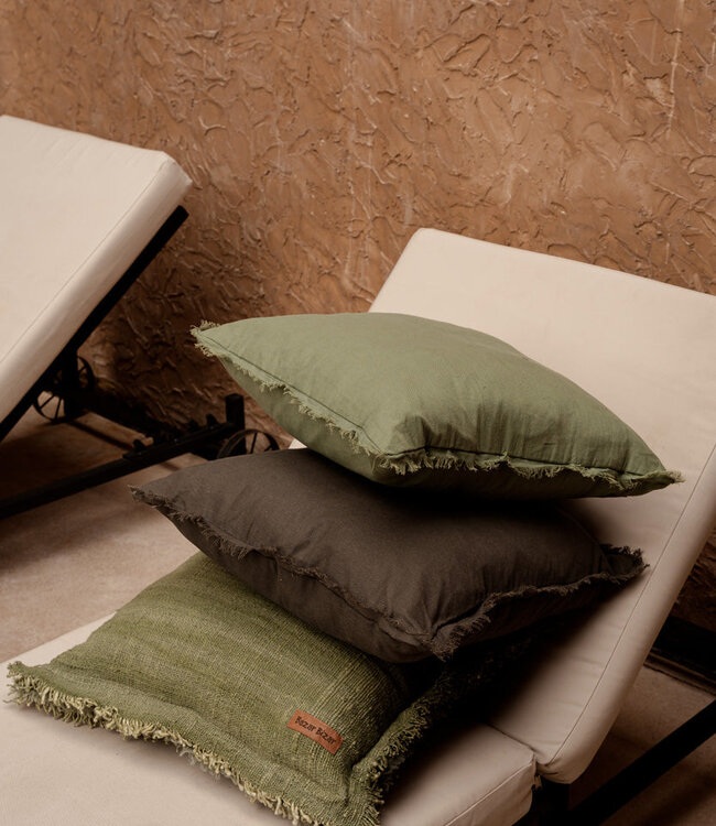 De Jungle Fringe kussenhoes vormt een verfijnd accent voor elke zitplek. De subtiele franjezoom voegt een zachte beweging toe en vergroot de flexibiliteit in styling, waardoor het model zowel seizoengebonden als tijdloos kan worden toegepast. Het vierkante formaat van 50 x 50 cm biedt aanwezigheid zonder te domineren en is eenvoudig te combineren op banken, fauteuils of als onderdeel van een gelaagde bedopstelling. De gedempte groentint brengt een natuurlijke harmonie en past moeiteloos in zowel landelijke als moderne interieurs. De katoenen stof garandeert duurzaamheid en een ademend, prettig aanvoelend oppervlak, geschikt voor dagelijks gebruik. Elke hoes is met de hand vervaardigd; kleine variaties in weving en kleur zijn bewuste resultaten van ambachtelijke productie en geven elk exemplaar een eigen karakter, waardoor uw interieur een uniek detail krijgt.
