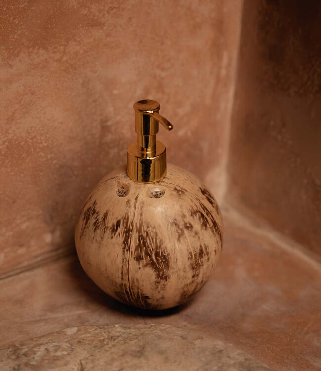 De Kokoszeepdispenser transformeert het dagelijkse handwasritueel tot een tactiele en verfijnde ervaring. Gemaakt van een echte kokosschelp in combinatie met een gepolijste messingpomp, verenigt dit ontwerp ruwe natuurlijke textuur met een elegante, luxueuze uitstraling. Met praktische afmetingen biedt de dispenser voldoende inhoud voor dagelijks gebruik en blijft hij compact genoeg voor kleine aanrechten. De afgeronde silhouet staat stabiel en de warme bruintint past naadloos in moderne, tropische en rustieke interieurs. Handgemaakt in Indonesië draagt ieder exemplaar de organische schoonheid van zijn herkomst. Houd er rekening mee dat kleine variaties in afmeting, kleur en structuur door het gebruik van echte kokosschelpen vanzelfsprekend zijn en juist bijdragen aan de uniciteit van elk stuk.