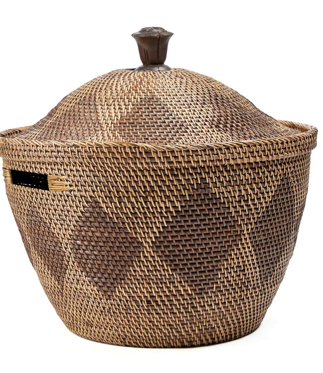 Met een geraffineerde vormgeving is de Storage Crown Basket een met de hand gevlochten rattan-opbergmand die functionaliteit en sculpturale esthetiek verenigt. Het deksel, geïnspireerd op een kroon, trekt de aandacht terwijl de ruime, komvormige bak zich uitstekend leent voor het bewaren van bedlinnen, plaids of kinderspeelgoed. De warme, natuurlijke bruintinten versterken het decoratieve karakter en maken de mand geschikt voor zowel kustinterieurs en rustieke lofts als moderne stedelijke woningen. Hij transformeert alledaagse organisatie tot een doordacht designelement. Vervaardigd in Indonesië, weerspiegelt elk exemplaar de vakmanschap van traditionele vlechttechnieken. Variaties in weefpatroon en kleurtonen zorgen voor individuele nuances, waardoor ieder stuk persoonlijk, authentiek en subtiel luxueus aanvoelt. Producttype: manden Kleur: naturel bruin Materiaal: rattan Land van herkomst: Indonesië Afmetingen: 52x55x55 cm