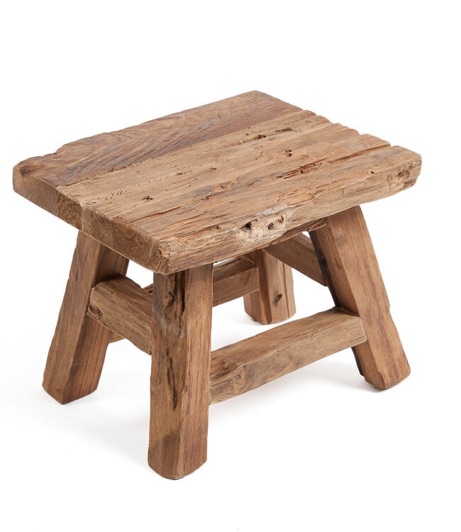 De Yoke-kruk is verkrijgbaar in twee maten en heeft een rijke, rustieke afwerking die karakter toevoegt aan elke ruimte. Handgemaakt van gerecycled teakhout, belichaamt hij duurzaam design en tijdloze schoonheid. De diepe, verweerde finish geeft een authe