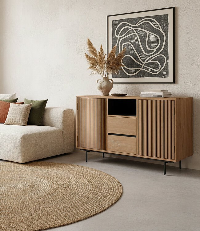 Het Rhythm Dressoir van gerecycled teak is een moderne, functionele en tijdloze toevoeging aan elk interieur. Met zijn strakke lijnen en warme teakkleur is dit dressoir een uitnodigende blikvanger in huis. De subtiele zwarte details zorgen voor een eigentijdse maar tijdloze uitstraling, en de combinatie van open vakken en afsluitbare compartimenten biedt voldoende ruimte voor het opbergen van servies, woonaccessoires of documenten.