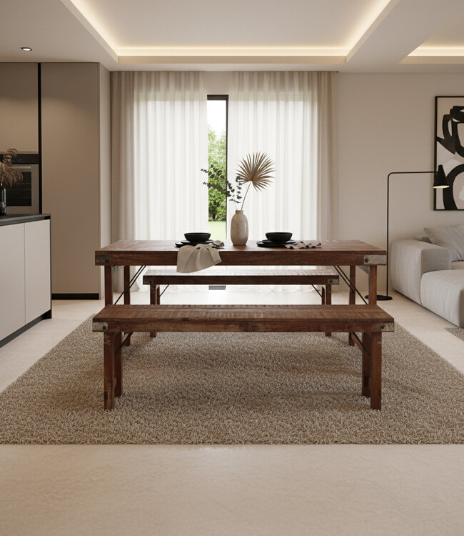 Deze inklapbare eetkamerbank van FSC-gerecycled hout is een handige, duurzame en unieke toevoeging aan uw interieur. Met zijn inklapbare ontwerp is deze bank gemakkelijk op te bergen, ideaal voor flexibele ruimtes of kleinere eetkamers. Verkrijgbaar in verschillende maten, waaronder een kortere variant van 120 cm, zodat er altijd een geschikte maat is voor uw interieur. Doordat elke bank van gerecycled hout uniek is, verschillen tint, nerf en afwerking enigszins van de afbeelding, wat bijdraagt aan de karakteristieke uitstraling van het meubelstuk.