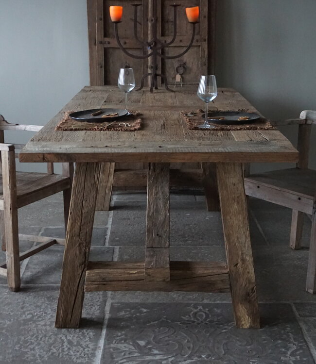 Eetkamertafel Teun combineert robuust oud eikenhout met een tijdloos design. Met een royale lengte van 220 cm biedt hij volop ruimte voor gezellige diners. De stevige afwerking en stoere look maken hem een blikvanger in elk interieur. Ook verkrijgbaar in een andere variant!