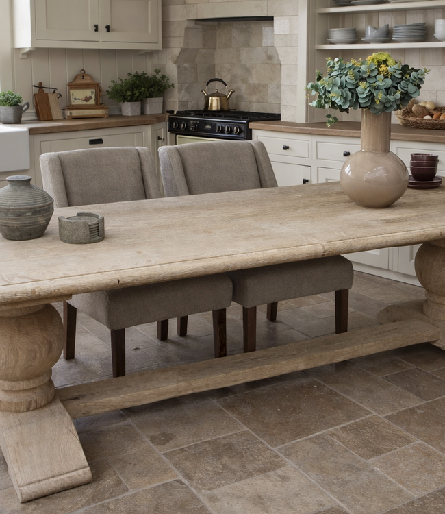 Karakteristieke eikenhouten tafel van maar liefst 280 cm lang! De perfecte plek om uitgebreid te tafelen met familie en vrienden. Het massieve blad is stijlvol afgewerkt met een vogelbekrand en geeft de tafel een warme uitstraling. De tafel is 92 cm diep en 75 cm hoog.