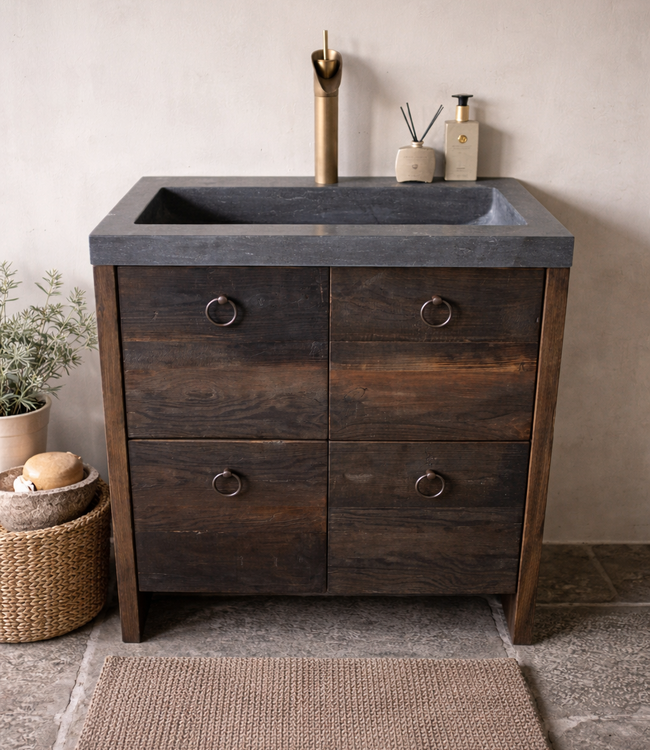 Elsje is een landelijk badkamermeubel, volledig geproduceerd in eigen werkplaats. De Small variant kan worden gemaakt in de lengte van 60 t/m 90 cm en wordt inclusief RAW Hardstenen wasbak geleverd. Het meubel is gemaakt van oude wagondelen, welke we zelf importeren en bewerken in onze werkplaats. Het badkamermeubel heeft vier lades met softclose sluiting en oud ijzeren handgreepjes voor die landelijke look. De binnenkant van de lades bevat multiplex in de kleur antraciet.