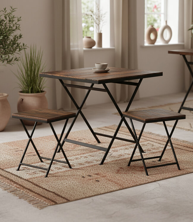 Er zijn momenten waarop extra tafelruimte gewenst is, zonder dat er permanent een groot meubel in de weg staat. De inklapbare tafel uit de Factory-collectie biedt een doordachte combinatie van gebruiksgemak en een robuuste, industriële uitstraling. Het massieve houten blad in combinatie met een slank metalen onderstel zorgt voor direct karakter in elke ruimte. Geschikt als tijdelijke werkplek, sfeervol koffiehoekje of als praktische bijzettafel tijdens een bijeenkomst; na gebruik klapt u de tafel eenvoudig plat en bergt u hem compact op achter een kast of onder de bank. Er is optioneel een bijpassende inklapbare kruk verkrijgbaar om de set compleet te maken.