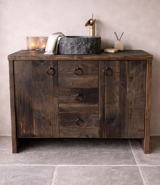 Badmeubel Fien is volledig gemaakt van oud hout in onze eigen werkplaats, behandeld en voorzien van 3 lades en 2 deurtjes. De deuren en lades zijn voorzien van soft-close zodat ze eenvoudig geopend en gesloten kunnen worden. Via het keuzemenu kan het meubel volledig behandeld tegen spatwater besteld worden. De lengte van 120 cm en hoogte van 80 cm zijn gangbare maten. Toch graag andere maten? Het meubel is aan de binnenzijde afgewerkt met plaatmateriaal van multiplex met watervaste HPL toplaag . Dit landelijke badkamermeubel kunnen we volledig op maat maken in onze eigen werkplaats. Kies in het keuzemenu de gewenste lengte en of het meubel gemaakt moet worden met afvoergat(en) of zonder. Aangezien we met natuurlijk materiaal werken kan er kleurverschil per meubel in zitten. Andere diepte maat, hoogte, etc, neem contact met ons op. De levertijd van Fien is 3/5 weken, met uiteraard gratis levering aan huis in Nederland & België.