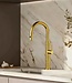 Deze geborsteld gouden keukenkraan heeft een luxe en warme uitstraling en combineert design met functionaliteit. De hoge U-vormige uitloop en de uittrekbare sproeikop zorgen voor optimaal gebruiksgemak in moderne en stijlvolle keukens.
