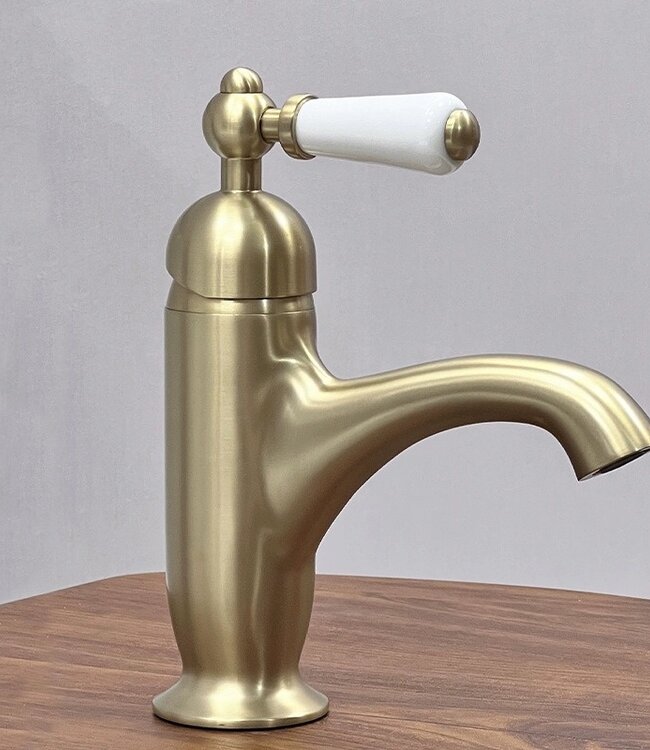 Deze geborsteld gouden nostalgische wastafelkraan met witte keramische hendel voegt een luxe, klassieke uitstraling toe aan iedere badkamer of toiletruimte. De tijdloze vormgeving met gebogen uitloop en porseleinen handgreep past perfect in landelijke of retro-interieurs. Dankzij het hoogwaardige keramische binnenwerk is de bediening soepel, nauwkeurig en duurzaam in gebruik.