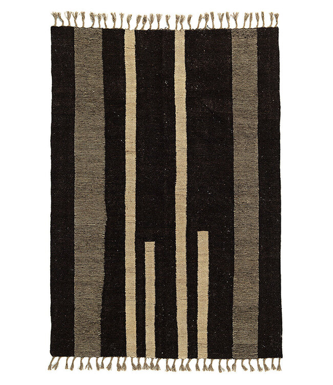 Met afmetingen van 300 × 205 cm biedt het evenwichtige verhoudingen voor eetopstellingen, loungen of gelaagde open-plan interieurs. Wolvezels garanderen veerkracht en blijven tegelijkertijd zacht onder de voet; het grafische ontwerp laat het vloerkleed moeiteloos schakelen tussen modern minimalisme en rustieke warmte.