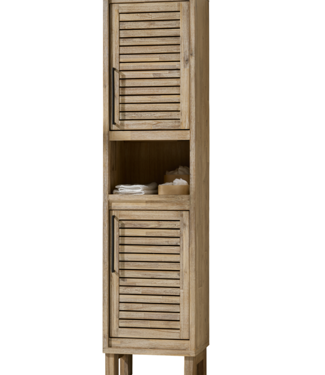 Deze Kolomkast van Acadia hout (B45xD38xH176 cm) met twee deuren en een open middenvak is echt een eyecatcher. Ideaal voor handdoeken en badkameraccessoires. Het slanke design past in elke badkamer en is perfect te combineren met de bijpassende spiegel en badkamermeubel.