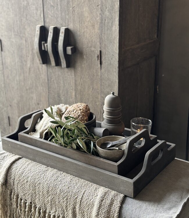 Dit vergrijsde dienblad van het landelijke merk Aura Peeperkorn is een plaatje op iedere tafel! Het houten dienblad staat prachtig als decoratie op de tafel of aanrecht en is verkrijgbaar in drie rechthoekige afmetingen en in een vierkanten afmeting.