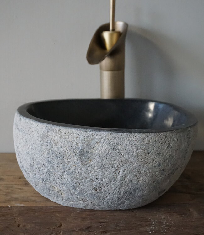 Stenen waskom van riviersteen in een kleine afmeting voor het toilet. Door de buitenkant onbewerkt te laten is elke waskom uniek. Deze wastafel is praktisch voor dagelijks gebruik maar ook een zeer mooie decoratie voor in het interieur.