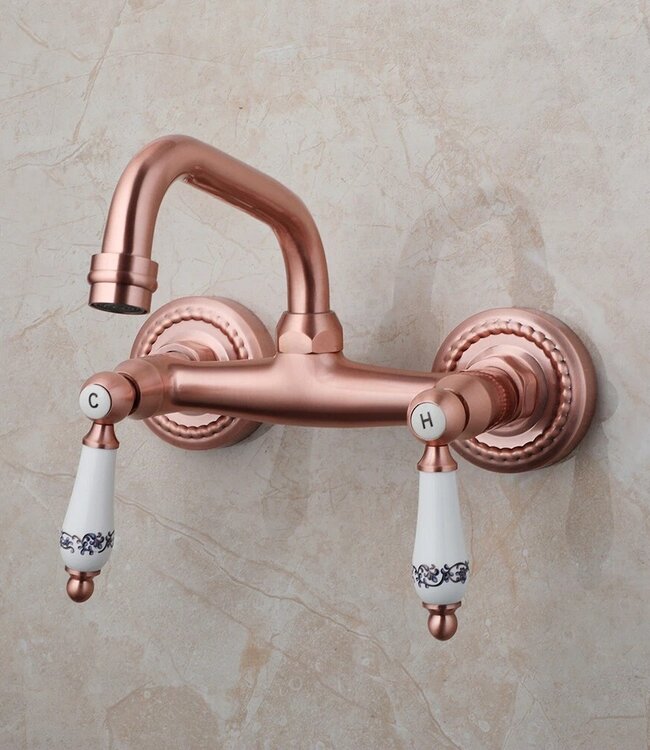 Deze koperkleurige muurkraan met landelijke uitstraling combineert klassieke charme met modern gebruiksgemak. De keramische handgrepen zorgen voor een authentieke look en een prettige bediening in badkamer of keuken.