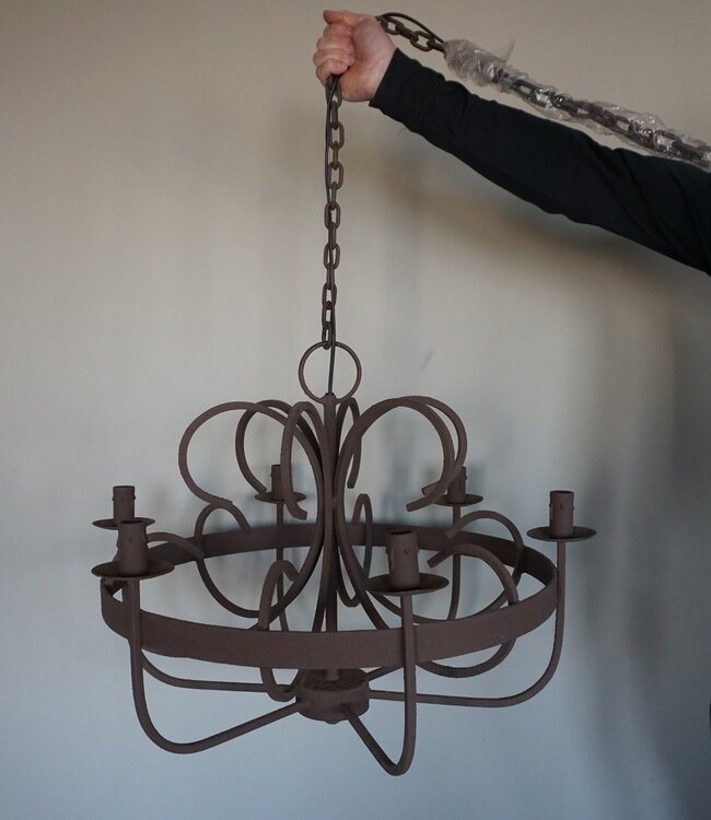 De kroonluchter Garra is een eyecatcher in ieder interieur! De kroonluchter heeft 6 armen en prachtig gevormde details. De roestige kleur past perfect in een landelijke keuken, woonkamer of hal. De lamp is maar liefst 55 cm hoog en heeft een maximale diameter van 61 cm.