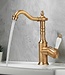 Deze landelijke wastafelkraan in bronskleur brengt een warme, nostalgische sfeer in de badkamer of keuken. De sierlijk gebogen uitloop, klassieke details en porseleinen hendel zorgen voor een authentieke uitstraling die perfect past bij landelijke en klassieke interieurs.