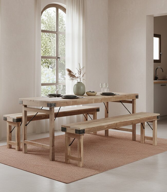 Deze inklapbare eettafel is geïnspireerd op de traditionele klaptafels uit India, die al vele jaren werden gebruikt bij kleurrijke bruiloften, festivals en grote evenementen. Ze waren gemakkelijk op te zetten, snel in te klappen en eenvoudig te verplaatsen naar een andere locatie. Deze praktische veelzijdigheid maakt de tafel perfect voor evenementen, restaurants, hotels en thuisgebruik. Zowel binnen als buiten te gebruiken.