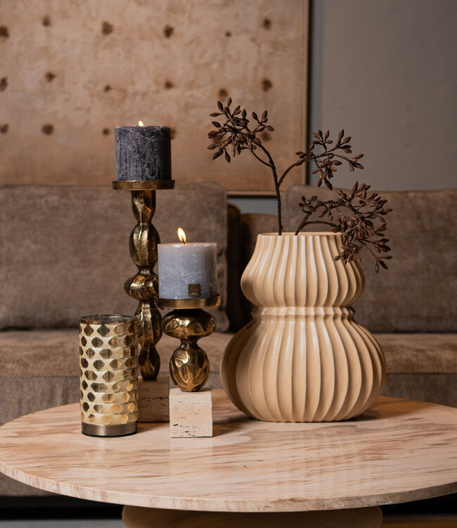 De "Malines" gouden gegoten aluminium kaarsenhouder op voet is een prachtige toevoeging aan uw interieur. Met zijn elegante ontwerp en duurzame materialen is deze kaarsenhouder een perfecte keuze voor het toevoegen van een vleugje luxe aan elke kamer. Met