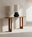 Chamfered mangohouten wandtafel uit de Bullnose-collectie, ideaal voor een stijlvolle, functionele invulling van hal, gang of achter de bank. Met afmetingen van 140 x 40 x 80 cm biedt deze slanke wandtafel plaats voor sleutels, woonaccessoires of een decoratieve lamp, zonder veel ruimte in te nemen. Het blad is vervaardigd van massief mangohout en onderscheidt zich door de bijzondere afwerking met schuin afgewerkte, afgeronde randen (bullnose) voor een verfijnde uitstraling. Duurzaamheid en herkomst Mangobomen groeien in India en zijn na circa 15 jaar geoogstbaar, waarna ze vaak plaatsmaken voor nieuwe aanplant. Dit meubel geeft het hout een duurzaam tweede leven nadat het jarenlang fruit heeft geleverd. Elk exemplaar heeft een unieke houttekening en veervormige nerven, wat zorgt voor een authentiek, karaktervol meubelstuk. Afwerking en onderhoud Het blad is behandeld met een waterafstotende sealer voor dagelijks gebruik. Gebruik onderzetters bij vazen en glazen om kringen te voorkomen. Voor dagelijkse reiniging volstaat een lichtvochtige doek; om de natuurlijke glans te herstellen kunt u het hout jaarlijks behandelen met geschikte was of olie. Stylingadvies Plaats een grote spiegel boven de tafel voor een ruimtelijk effect, of zet er een stijlvolle tafellamp op voor sfeer. Onder het blad creëert u opbergruimte met rieten manden voor sjaals en overige accessoires. Belangrijkste kenmerken: - Materiaal: massief mangohout - Kleur: bruin - Afmetingen: 140 x 40 x 80 cm - Onderscheidende bullnose-afwerking met schuin afgewerkte randen - Unieke houtnerf en vlamtekening per stuk - Onderdeel van een complete serie met bijpassende eettafels en eetkamerbanken