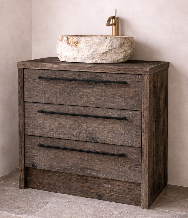 Ontdek het Melana Badmeubel. Het badmeubel is gemaakt van geborsteld oud eikenhouten in onze eigen ambachtelijke werkplaats. Het badmeubel heeft drie grote lades wat zorgt voor meer dan genoeg opbergruimte, zodat je badkamer netjes en opgeruimd blijft. Doordat we het meubel in eigen werkplaats maken, is hij in meerdere afmetingen te verkrijgen. Gewenste maat niet gevonden? Neem contact met ons op!