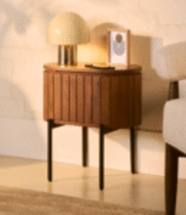 Het Mokka nachtkastje combineert tijdloze eenvoud met hoogwaardige materialen en past direct in een volwassen slaapkamerinterieur. Het nachtkastje is vervaardigd uit mangohout met een natuurlijk, licht variërende nerf en is herkenbaar aan de karakteristieke latjes aan de voorkant. De afgeronde hoeken en het zachte lijnenspel zorgen voor een vriendelijke, geraffineerde uitstraling. Met afmetingen van 50 x 30 x 45 cm is het model praktisch naast elk bed: voldoende hoogte voor een boek of glas water en achter het deurtje voldoende opbergruimte voor opladers, notities of een leesbril. Het kastje staat op ronde metalen pootjes, waardoor het licht van de vloer wordt opgetild en een subtiele zwevende indruk ontstaat. Beschikbaar in twee tinten: donkerbruin voor extra warmte en lichtbruin voor een frisse, rustige basis.