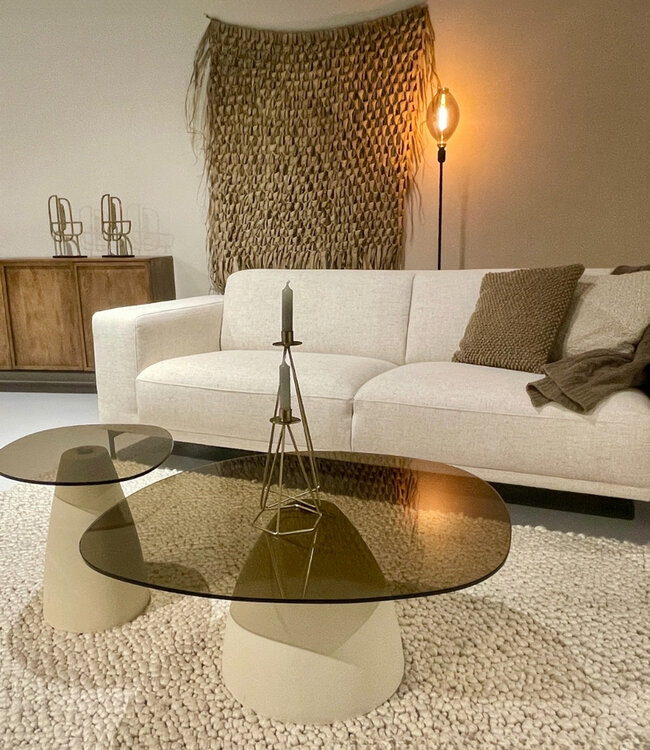 De Brix Mylon salontafels combineren elegantie met moderne materialen. Vervaardigd van rookglas, wat een verfijnde uitstraling geeft, en ondersteund door een stalen poot die is afgewerkt in een stijlvolle ivoorkleurige coating. Mylon is perfecte mix van hedendaags design en duurzame materialen, waardoor ze zowel functioneel als esthetisch aantrekkelijk zijn voor elk interieur.