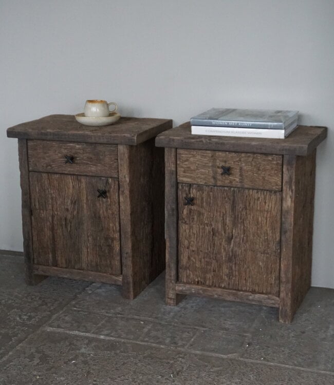 Mooi robuust nachtkastje, geproduceerd in eigen werkplaats! Het nachtkastje is gemaakt van oud eikenhouten geborstelde wagonplanken, wat zorgt voor een karaktervolle en stoere uitstraling. De afmetingen van het kastje zijn 60 cm hoog, 50 cm breed en 35 cm diep.