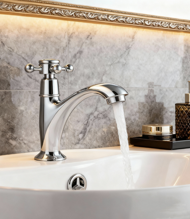 Deze elegante nostalgische koudwaterkraan in chroomafwerking is een perfecte keuze voor badkamers met een klassieke of landelijke uitstraling. De sierlijke kruisgreep en tijdloze details zorgen voor een luxe en verfijnde afwerking.