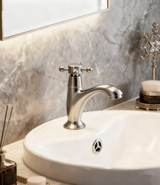 Deze nostalgische koudwaterkraan in geborsteld nikkel afwerking is een stijlvolle toevoeging aan elke klassieke of landelijke badkamer. De zachte matte nikkel structuur geeft een warme, luxueuze uitstraling die perfect aansluit bij moderne en tijdloze stijlen.