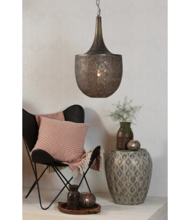 Met een hanglamp als de Tanya in huis waan je je in Oosterse sferen. De metalen hanglamp doet denken aan straten en lantaarns van Marrakech dankzij het motief op de kap en kleur. Het metaal in de kap is volledig geperforeerd zodat er genoeg licht door heen kan komen. De kap is van onder open en hangt aan een metalen ketting die is in te korten door er schakels tussenuit te halen. De geweldige Oosterse hanglamp wordt aan het plafond opgehangen met een metalen bevestiging.