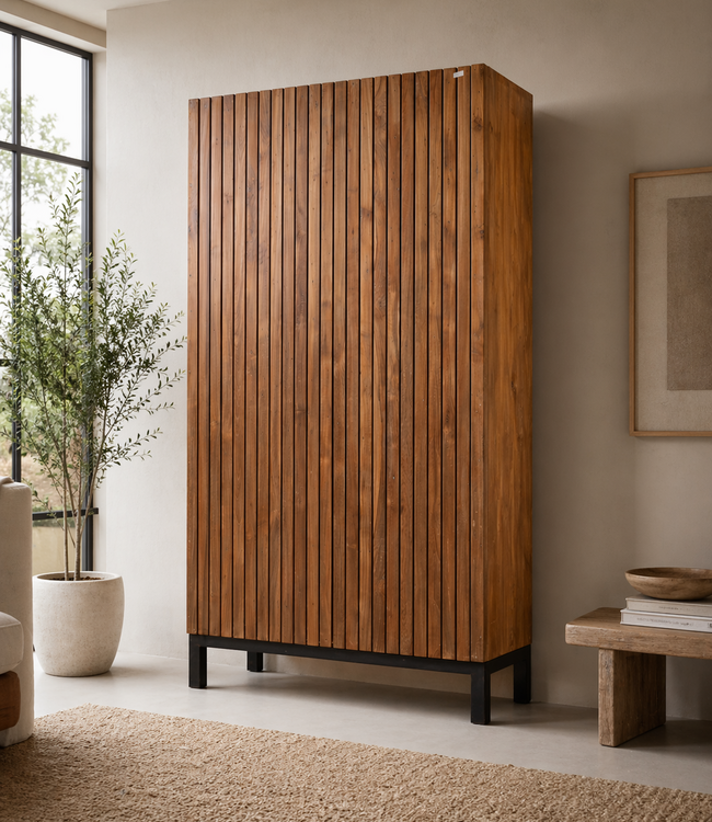 Deze stijlvolle kast combineert een warme, natuurlijke uitstraling met een strak en modern lijnenspel. Het verticale lattenfront geeft de kast een verfijnd karakter en zorgt voor een rustige, ritmische look die in vrijwel elk interieur tot zijn recht komt.