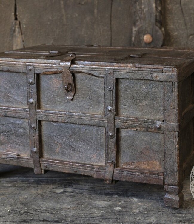 Origineel oud Dauri kistje uit India met een authentieke, doorleefde uitstraling. Dit unieke exemplaar is met de hand gemaakt en rijk aan karakter. Prachtig als decoratief item of om kleine spullen stijlvol in op te bergen.