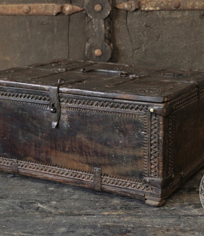 Origineel oud Dauri kistje uit India met een authentieke, doorleefde uitstraling. Dit unieke exemplaar is met de hand gemaakt en rijk aan karakter. Prachtig als decoratief item of om kleine spullen stijlvol in op te bergen.