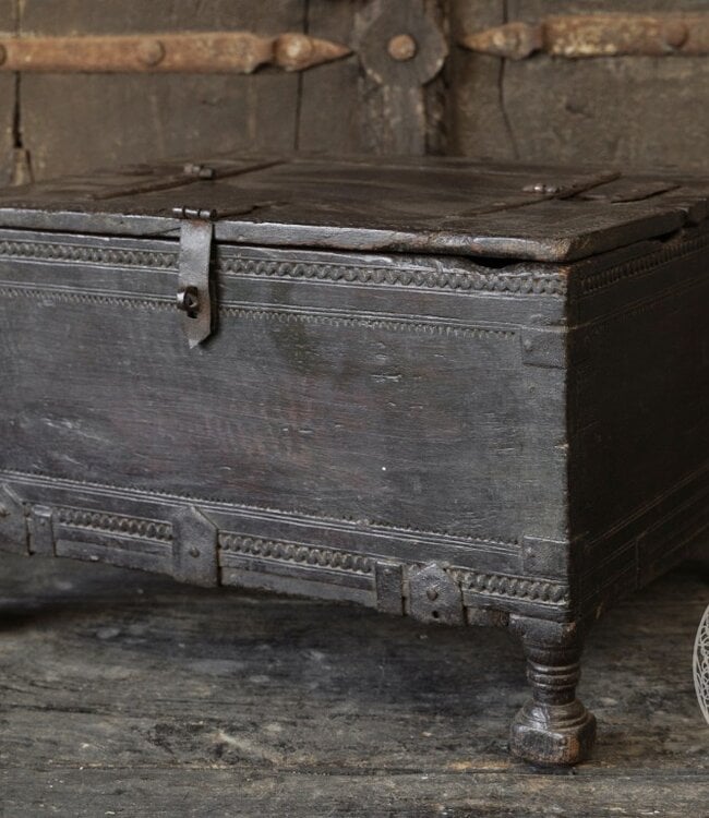 Origineel oud Dauri kistje uit India met een authentieke, doorleefde uitstraling. Dit unieke exemplaar is met de hand gemaakt en rijk aan karakter. Prachtig als decoratief item of om kleine spullen stijlvol in op te bergen.
