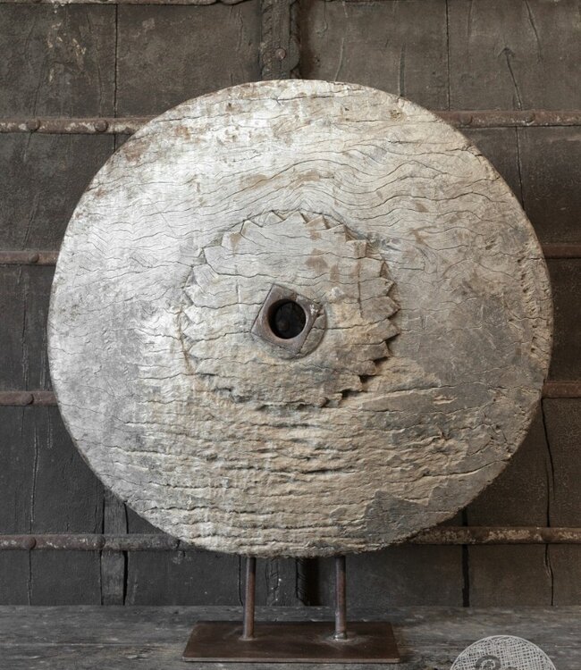 Dit oude wiel op standaard is een eyecatcher in iedere ruimte! Het wiel is gemaakt van hout en heeft een verweerde look, wat perfect past bij een landelijke stijl. Het beeld is een uniek exemplaar en afkomstig uit India, wat zorgt voor een authentieke uitstraling.