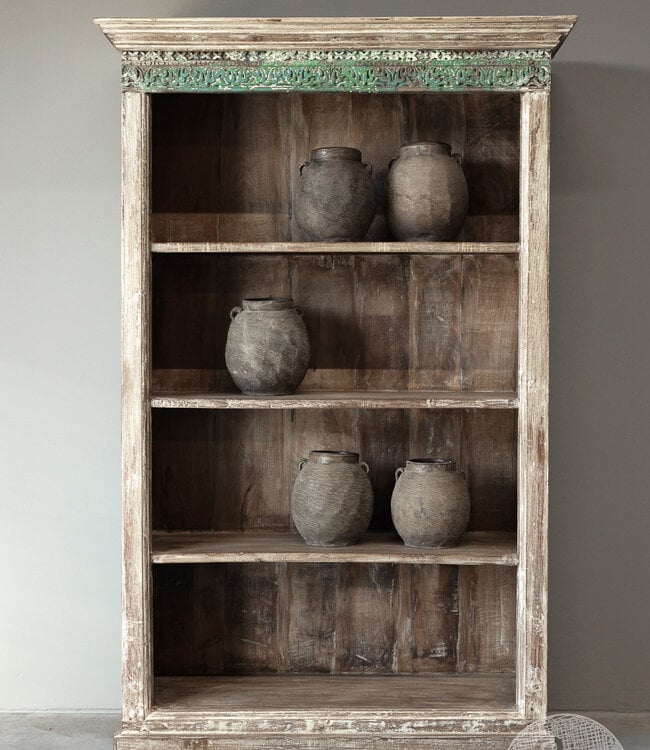 Oude boekenkast uit India met een authentieke, doorleefde uitstraling. Gemaakt van massief hout met unieke details en karaktervolle sporen van gebruik. Perfect voor het stijlvol opbergen van boeken en accessoires en een warme, sfeervolle toevoeging aan elk interieur.