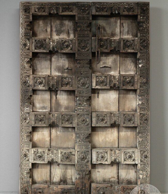 Deze originele oude deur India heeft de afmetingen H158 x B100 x D8 Cm en is werkelijk bijzonder. Het oude houtsnijwerk in combinatie met de verschillende verweerde kleuren maken dit een unieke deurset die zowel als decoratie kan functioneren, maar ook als deurset.