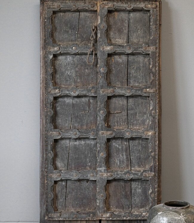 Oude deur uit India (H160xB79xD6 cm) met een unieke, doorleefde uitstraling. Dit authentieke stuk weerspiegelt traditioneel vakmanschap en rijke historie. Een karaktervol decoratief element dat warmte, sfeer en tijdloze charme toevoegt aan elk interieur.